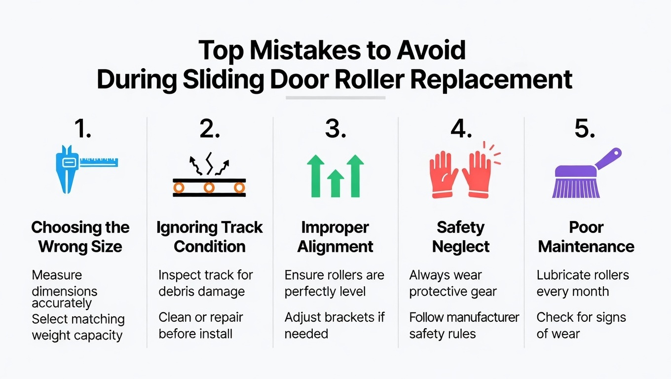 | Forkert rullestørrelse | Døren sidder mærkeligt, vil ikke låse, trækker stadig | Diameter/offset/belastningsklassificering uoverensstemmelse | Match rullespecifikationer til originalen; verificer hjuldiameter og husdybde |